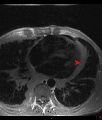 This axial spin echo image shows a pericardium that is thicker than the normal 3 mm (arrowhead). This finding is consistent with constrictive pericarditis, but clinical correlation is necessary to determine if the patient is symptomatic.