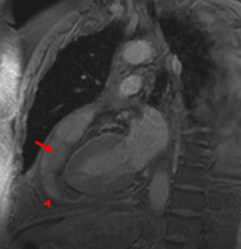 The two chamber long axis T1-weigted fat saturated gradient echo image demonstrates effusive constrictive pericarditis. Notice the septated pericardial effusion (arrow) and the thickened pericardium (arrowhead).