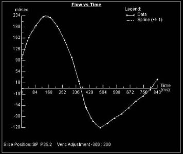 On the top is a VENC cine from a patient with pulmonary regurgitation. Flow out of the heart is white while regurgitant flow is black (arrow). The Flow vs. Time graph is on the bottom. The area under the positive part of the curve represents total forward flow while the area under the negative part of the curve represents total reverse flow.