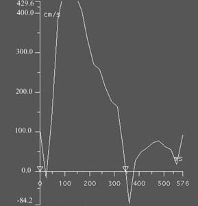 On the top is a VENC cine from a patient with aortic stenosis secondary to a bicuspid aortic valve. The VENC is oriented perpendicular to the high velocity jet, which appear black on this cine (arrow). The graph on the bottom displays peak velocity across the aortic valve versus time. The flowing blood has a maximum velocity of about 450 cm/s during systole. The normal peak velocity across the aortic valve should be less than 200 cm/s; the increased velocity in this patient is due to severe aortic stenosis.