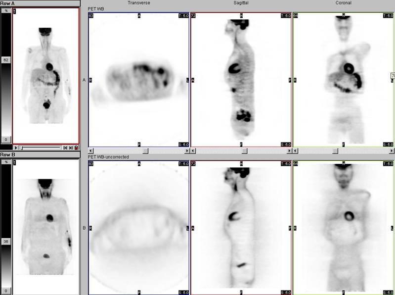 The non-attenuation-corrected data shown in the bottom row confirms that there is actually no increased activity in the region of the colon, as was apparent on the attenuation-corrected data shown in the top row. The attenuation correction process resulted in artifactually increased activity related to highly concentrated metallic density barium within the lumen of the colon.