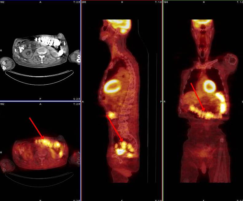 Patient had had an upper GI barium examination one week prior to PET/CT to evaluate for nausea and vomiting. Evaluation of the abdomen and pelvis is limited by artifact created by retained barium within the colon. Careful evaluation of the non-attenuation-corrected and attenuation-corrected data sets as well as the CT data demonstrates no definite evidence for a gross abnormality in the abdomen or pelvis.