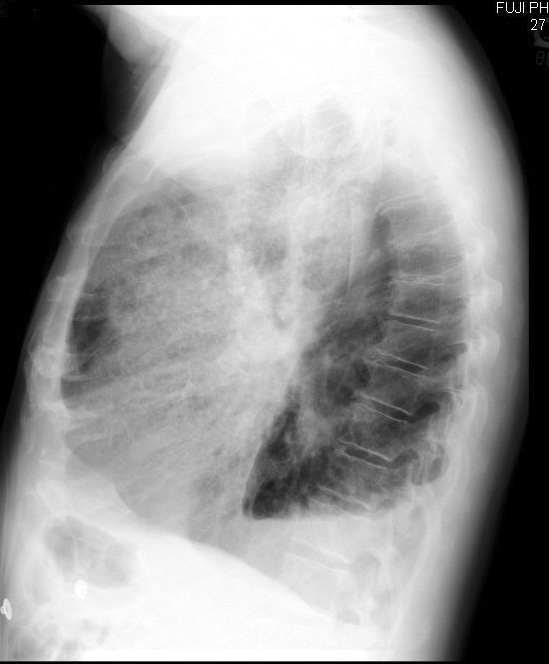 of a lateral chest x-ray. The blue arrows indicate the left ribs and the red