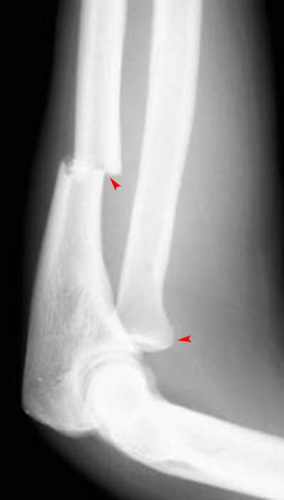 The arrows on the image above indicate an Ulnar Fracture and Radial Head Dislocation.