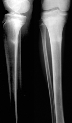 - Appears as a band of sclerosis in the proximal tibia on plain film.