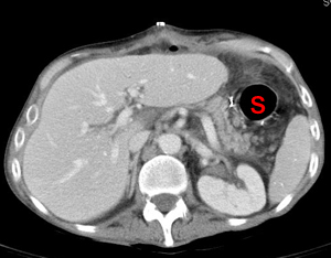 The gastric remnant (S) after a partial gastrectomy. This situation does not usually permit transillumination for endoscopic gastrostomy tube placement and requires CT guidance due to the distance from the abdominal wall and the smaller target.
