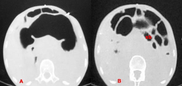 Air initially distends the stomach (A) but eventually will leak into the small bowel (sb) and peritoneal cavity (B), so continued insufflation is necessary.