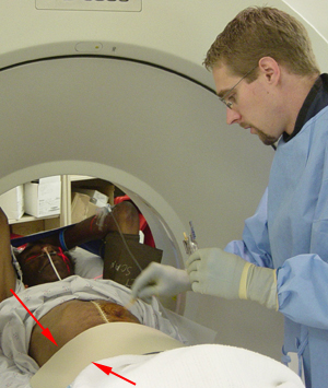 Prepping the patient. Note the lead shield (arrows) over patient's lower abdomen below the gastrostomy site to reduce scattered radiation to the operator