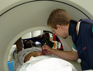 Plan the entrance site (x) by reference to the lead marker (arrow), lateral to the colon (c).
