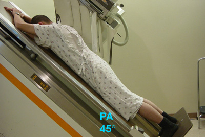 head of the table 45°. Place the barium bag between the patient's