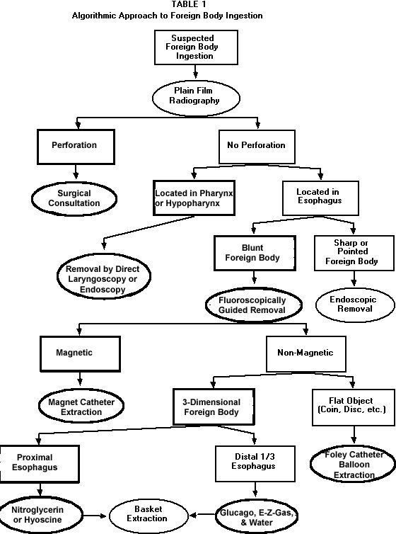 Our algorithm for managing foreign bodies in the esophagus is based on two considerations - the location of the foreign body and its characteristics (magnetism, shape, and sharpness of its edges). The algorithm is organized into a logical sequence that proceeds from the less invasive and cheaper methods to the more invasive and expensive ones.