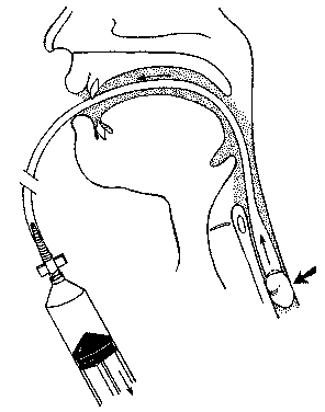Fig. 2.  Suction catheter FB extractor.  The distal end of a single-lumen 12-F nasogastric tube is cut off to remove all side holes.  The cut end is attached to a 60-ml syringe with a "Christmas tree" adapter.  The flared end of the tube (arrow) is used to vacuum foreign material from the esophagus.  (From Shaffer HA Jr, de Lange EE.  Diagnosis and treatment of food impactions and foreign bodies in the esophagus.  In Taveras JM, Ferrucci JT (eds).  RADIOLOGY: Diagnosis/Imaging/Intervention.  Philadelphia.  J. B. Lippincott Co., 1994, Volume 4, Chapter 15B, pp 1-11.  Reproduced by permission.)
