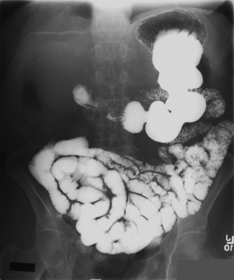 terminal ileum are routinely obtained. The terminal ileum is the most common location of small bowel pathology. Representative compression spot images of small bowel in all four quadrants of the abdomen are obtained to demonstrate that the entire small bowel was evaluated fluoroscopically.