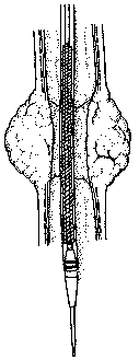 1. A 12-mm or 15-mm balloon catheter is then passed over the guidewire and inflated to distend and attach the stent more firmly to the esophageal wall (Fig. 4D).  Careful insertion and removal of the deflated balloon with fluoroscopic guidance is recommended to avoid inadvertent stent displacement.