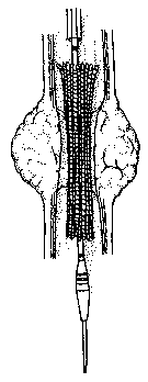 2. Upon exposure to esophageal moisture, the gelatin around the stent should completely dissolve and permit the stent to expand within 5 to 10 minutes (Fig. 1C).  If the stent does not expand within 10 minutes, a small amount of water may be instilled into the esophagus through a second catheter to accelerate stent expansion.  To prevent aspiration, the procedure table should be tilted with head up 30 to 45 degrees.