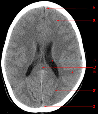 A. Falx Cerebri B. Frontal Lobe C. Body of the Lateral Ventricle D. Splenium of the Corpus Callosum E. Parietal Lobe F. Occipital Lobe G. Superior Sagittal Sinus