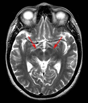 ![]() ![]() The two images above are T2-weighted axial images through the midbrain. |