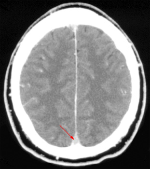 left shows thrombosis of the superior sagittal sinus (arrow) prior to