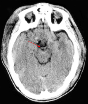Thrombosis of the basilar artery is a common finding in stroke patients. CT findings include a dense basilar artery without contrast injection.