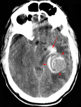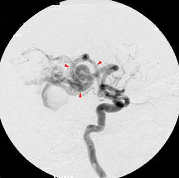 An underlying arteriovenous malformation (AVM) may or may not be visible on a CT scan. However, prominent vessels adjacent to the hematoma suggest an underlying arteriovenous malformation. In addition, some arteriovenous malformations contain dysplastic areas of calcification and may be visible as serpentine enhancing structures after contrast administration.