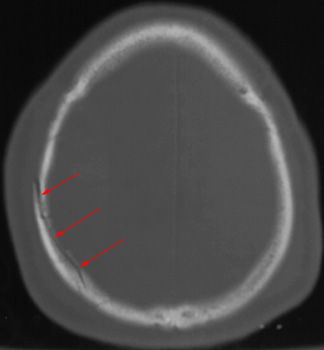 Skull fractures are categorized as linear or depressed, depending on whether the fracture fragments are depressed below the surface of the skull. Linear fractures are more common. The bone windows must be examined carefully. A skull fracture is most clinically significant if the paranasal sinus or skull base is involved. Fractures must be distinguished from sutures that occur in anatomical locations (sagittal, coronal, lambdoidal) and venous channels. Sutures have undulating margins both sutures and venous channels have sclerotic margins. Venous channels have undulating sides. Depressed fractures are characterized by inward displacement of fracture fragments.