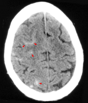 A subarachnoid hemorrhage occurs with injury of small arteries or veins on the surface of the brain. The ruptured vessel bleeds into the space between the pia and arachnoid matter. The most common cause of subarachnoid hemorrhage is trauma. In the absence of significant trauma, the most common cause of subarachnoid hemorrhage is the rupture of a cerebral aneurysm. When traumatic, subarachnoid hemorrhage occurs most commonly over the cerebral convexities or adjacent to otherwise injured brain (i.e. adjacent to a cerebral contusion). If there is a large amount of subarachnoid hemorrhage, particularly in the basilar cisterns, the physician should consider whether a ruptured aneurysm led to the subsequent trauma. Cerebral angiography may be needed for further evaluation. On CT, subarachnoid hemorrhage appears as focal high density in sulci and fissures or linear hyperdensity in the cerebral sulci. Again, the most common location of posttraumatic subarachnoid hemorrhage is over the cerebral convexity. This may be the only indication of cerebral injury.