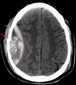 An epidural hematoma is usually associated with a skull fracture. It often occurs when an impact fractures the calvarium. The fractured bone lacerates a dural artery or a venous sinus. The blood from the ruptured vessel collects between the skull and dura. On CT, the hematoma forms a hyperdense biconvex mass. It is usually uniformly high density but may contain hypodense foci due to active bleeding. Since an epidural hematoma is extradural it can cross the dural reflections unlike a subdural hematoma. However an epidural hematoma usually does not cross suture lines where the dura tightly adheres to the adjacent skull.