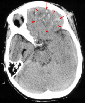 with foci of hemorrhage. Adjacent subarachnoid hemorrhage is common. After