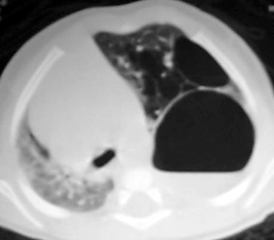 Chest CT on the same patient confirms a Type I CCAM with a large dominant cyst