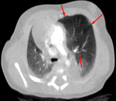 Chest CT on day 2 of life. The fluid has been absorbed and the left upper lobe is shown to be hyperinflated resulting in mass effect and shift of the mediastinum.