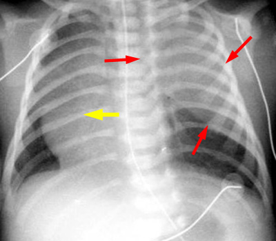 Initial postnatal CXR demonstrates a solid appearing mass in the left upper chest (red arrows) with mass effect and shift of the mediastinum (yellow arrow). At this point, the CLE is filled with fluid and thus mimics a solid mass.