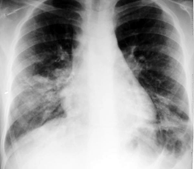 | Example of bilateral lower lobe opacities on CXR in a patient with Mycoplasma pneumoniae. | |