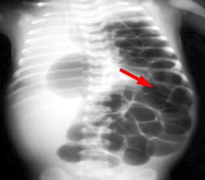 Congenital diaphragmatic hernia. The cystic lucencies in the left chest are shown to be continuous with the bowel gas indicating a defect in the diaphragm with herniation of bowel into the chest.