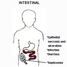 - Mechanism: loss of stem cells from intestinal crypts, leading to eventual loss of GI mucosa