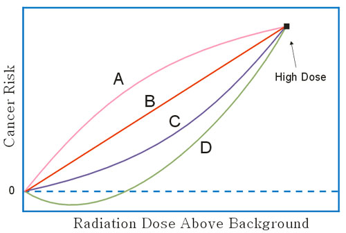 Alternative relationships for cancer risk vs. radiation dose as extrapolate to low-dose exposures, given a known risk at a high dose: supra-linearity (A), linear (B), linear-quadratic (C) and hormesis, which implies a biologically beneficial effect at low dose (D). |
