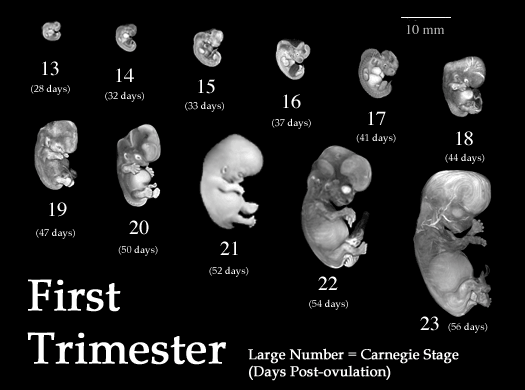 Embryos are most radiosensitive in the first trimester, particularly between 21 and 45 days, a period of major organogenesis. (Image modified from The Multi-Dimensional Human Embryo, a collaboration funded by the NICHHD) |